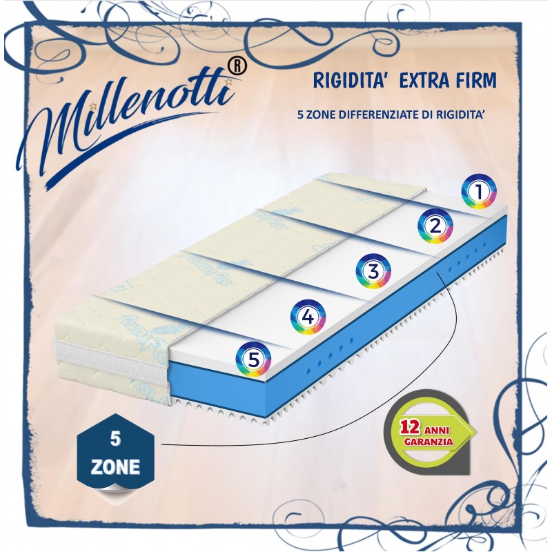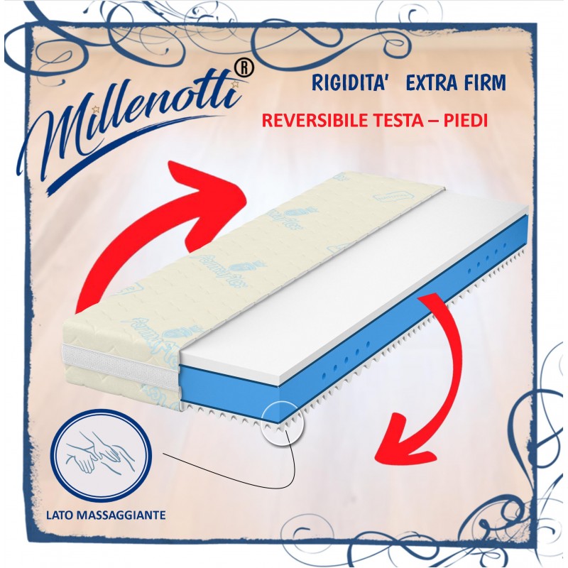 Materasso MILLENOTTI® Memory Base HARD rigidissimo / extra duro con un lato di memory firm alta densità da 5 cm ed un lato antisudore massaggiante. Versione con doppio feltro di rinforzo, 5 zone differenziate e completamente sfoderabile e lavabile disponibile singolo, piazza e mezza, matrimoniale e su misura con spessori differenti. Garantito 12 Anni. PROMOZIONE VALIDA SOLO PER L'ACQUISTO ONLINE