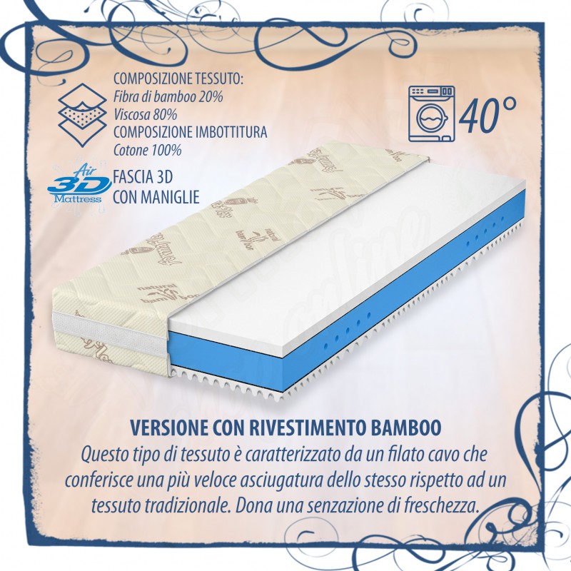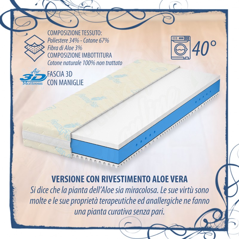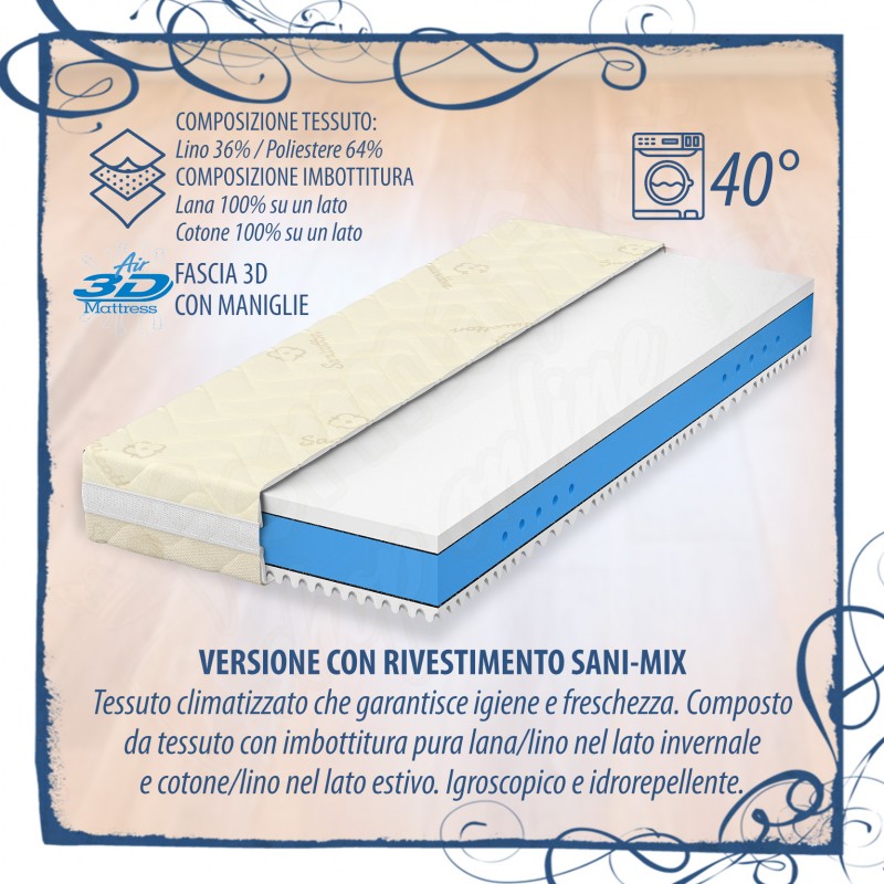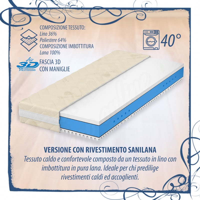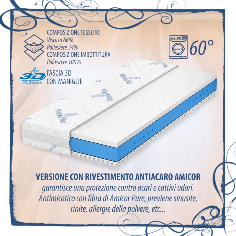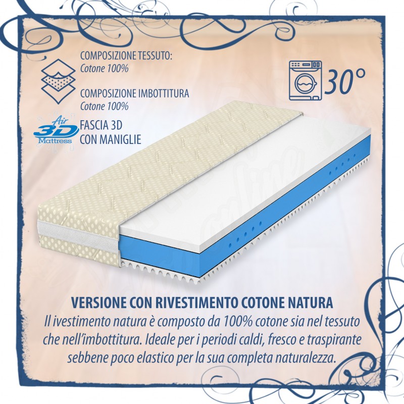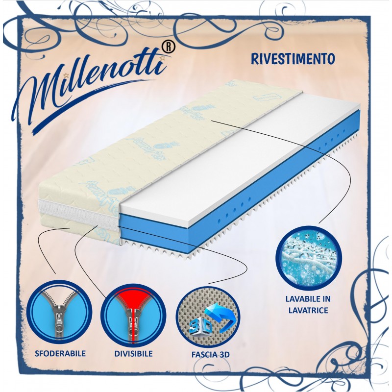 Materasso sfoderabile e lavabile in lavatrice per una maggiore igiene (VEDI TABELLA SOTTO PER LE TIPOLOGIE DI RIVESTIMENTO), con elevate caratteristiche anallergiche e traspiranti e lunga durata nel tempo. La cover/rivestimento del materasso è sfoderabile su tutti e 4 i lati e sganciabile per una maggiore praticità ed è comprensiva della fascia 3D traspirante con maniglie.