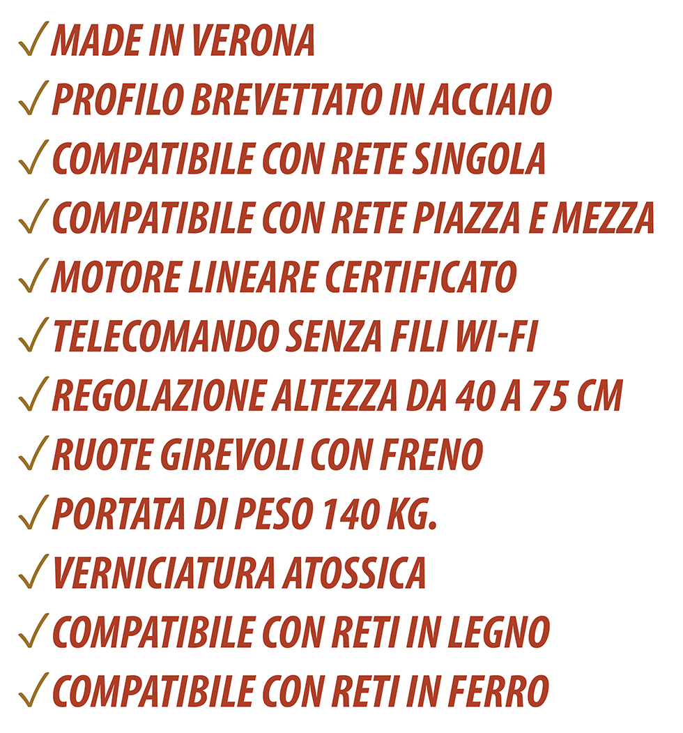 Prodotto utilizzabile con reti fisse e con movimenti testa/piedi manuali e motorizzate da 80 cm di larghezza fino ad un massimo di 120 cm. ATTENZIONE: la rete a doghe non è compresa e va fissata con dei bulloni direttamente ad i ganci con foro del sollevatore. E' consigliato utilizzare reti con telaio in legno.