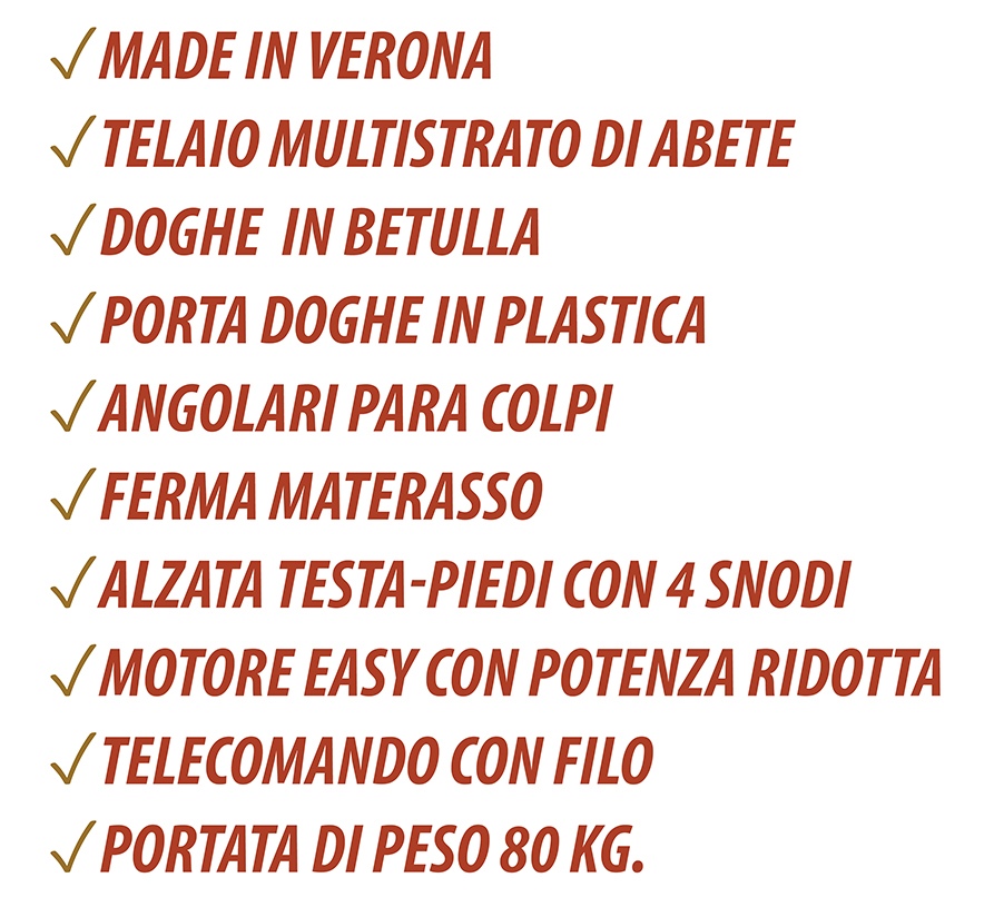 Struttura ergonomica Motorizzata con struttura metallica rinforzata a 4 movimenti motorizzati e 1 fisso. Telecomando a filo a 6 tasti. Consigliata per persone robuste e pesanti. Dotata di 28 doghe in faggio nella versione singola da 38 mm. Zona lombare con regolatori di rigidità di serie.